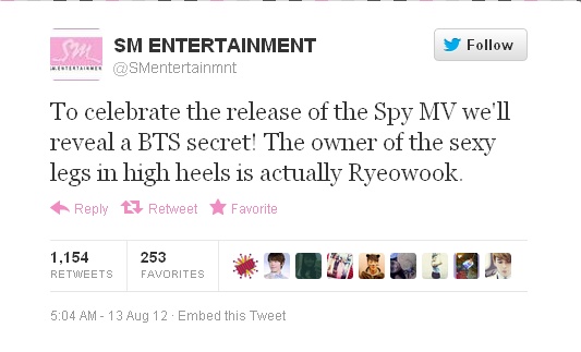 „Pentru a celebra lansarea MV-ului SPY vom spune un secret din spatele scenelor (BTS- behind the scene)! Proprietarul picioarelor sexy pe tocuri inalte este defapt Ryeowook”