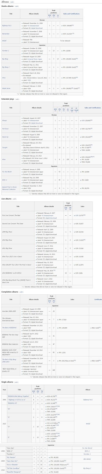 Pai vad ca fanii nu prea le cumpara albumele, fizice sau digitale nu conteaza.In aproape 10 ani nu au putut sa stranga mai multe vanzari de atat. Adica pe bune, au 5 ani in spate pe langa Exo, si doar atat? Exo sunt populari, din cate vad aici. Oricum, au debutat doar de aproape 5 ani. Ma intreb daca BB erau la fel de populari acum 5 ani ca Exo. BB de cand cu Fantastic Baby au inceput sa castige mai multe vizualizari.