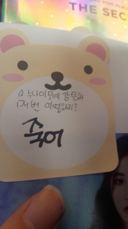 Un fan i-a scris membrei Eunseo pe un sticker: „Sunt fascinat de frumuseţea ta, ce să fac?”, iar aceasta a răspuns: „Mori„.