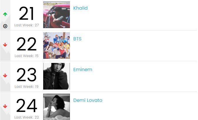 De asemenea, în acest clasament mai avem un artist coreean, este vorba de BTS, care a coborât pe locul 22, după ce săptămâna trecută a fost pe #15.