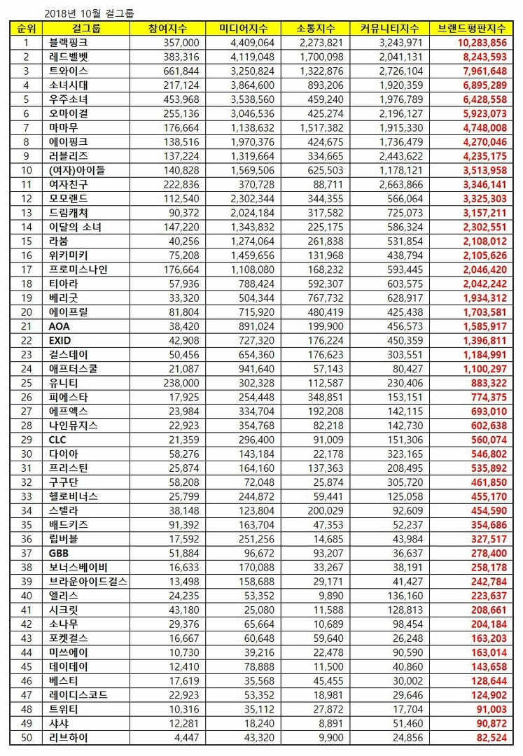 În perioada 11 septembrie – 12 octombrie au fost analizate peste 250 de milioane de postări din domeniile de participare, reputație, comunicare și comunitate. Potrivit Institutului de Reputație din Coreea, trupa Black Pink a ocupat prima poziție a clasamentului, fiind urmată de Red Velvet și TWICE.