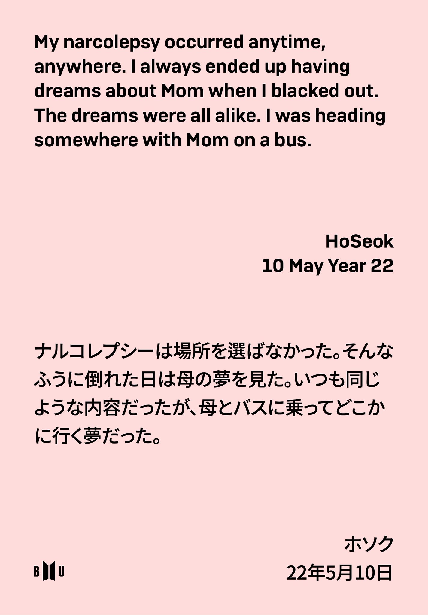 În recentul video postat pe Twitterul ‘SMERALDO BOOKS’, J-Hope merge singur pe o autostradă privind în gol, leşinând la scurt timp. Alături de acest video, a fost postat şi mesajul: „Crizele mele de narcolepsie puteau să apară oricând, la orice oră. Mereu o visam pe Mama atunci când îmi pierdeam cunoştinţa. Şi toate visele erau la fel. Mergeam undeva cu Mama în autobuz.”