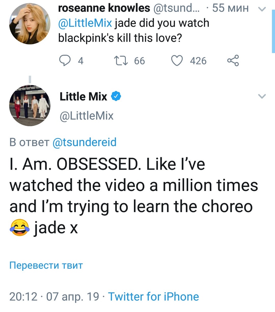 După cum știți deja, în data de 5 aprilie, celebrul grup de fete de la agenția YG Entertainment a avut un comeback exploziv cu mini-albumul „Kill This Love”, iar fanii au fost foarte curioși în legătură cu părerea artiștilor străini despre noua melodie de titlu cu același nume. Astfel, unul dintre Blinks a întrebat-o pe Jade din Little Mix, prin intermediul contului de Twitter: „Jade, ai urmărit videoclipul pentru piesa „Kill this love” de la Black Pink?”, iar ea a răspuns: „Eu. Sunt. Obsedată. L-am văzut de un milion de ori și încerc să învăț coregrafia 😂”.