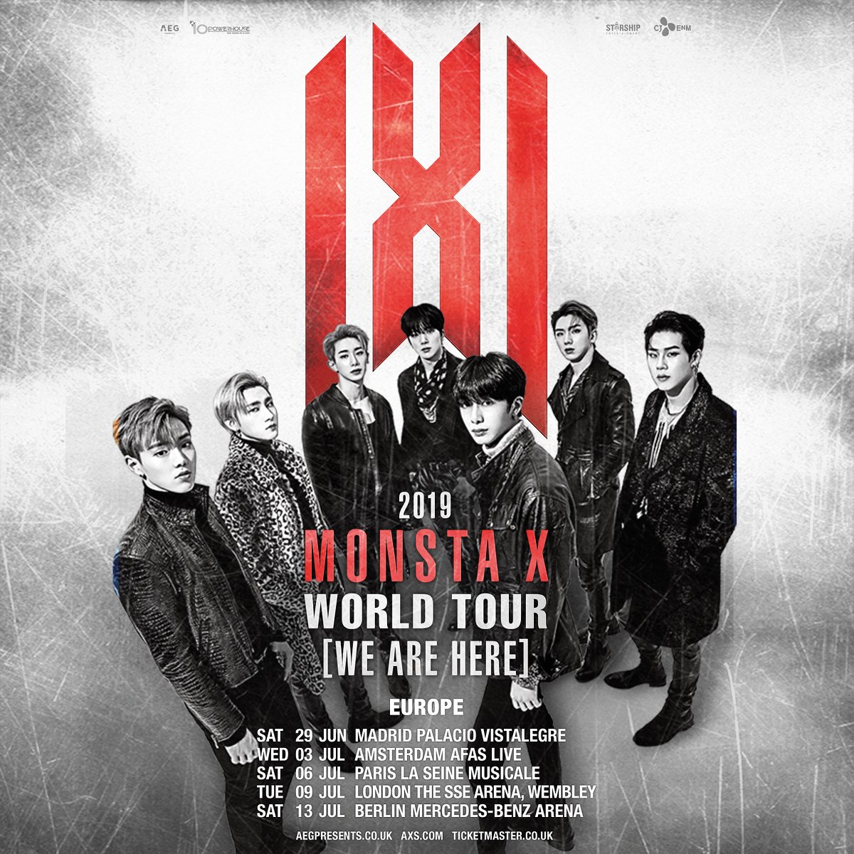 După cum am mai scris, trupa MONSTA X se îmbarcă într-un turneu mondial, ‘WE ARE HERE’, de amploare, care îi va aduce pe idoli și în Europa. Concertele vor avea loc la Madrid, Amsterdam, Paris, Londra și Berlin, după cum urmează: