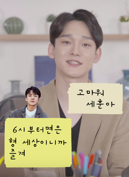 La acest comentariu, Chen a zis că și el va fi fericit și a mai adăugat – „Am ținut conferința de presă azi, iar Sehun a fost prezentatorul și după ce s-a terminat, i-am trimis un mesaj în care i-am mulțumit. Apoi, Sehun mi-a răspuns, ‘Când se face ora 18, hyung va fi momentul tău de glorie, așa că bucură-te.’ Aștept și eu cu nerăbdare și cred că voi fi fericit.”