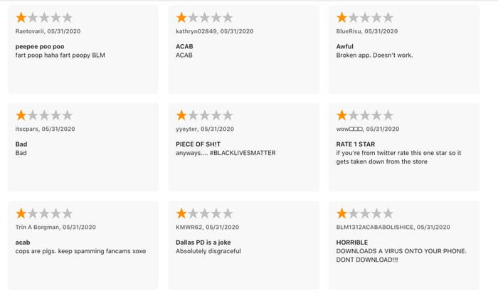 Pe lângă spam-ul cu fan cam-uri, internauții au dat aplicației un review de o stea atât pe App Store cât și pe Google Play, scriind la review Black Lives Matter și cerând justiție pentru George Floyd.
