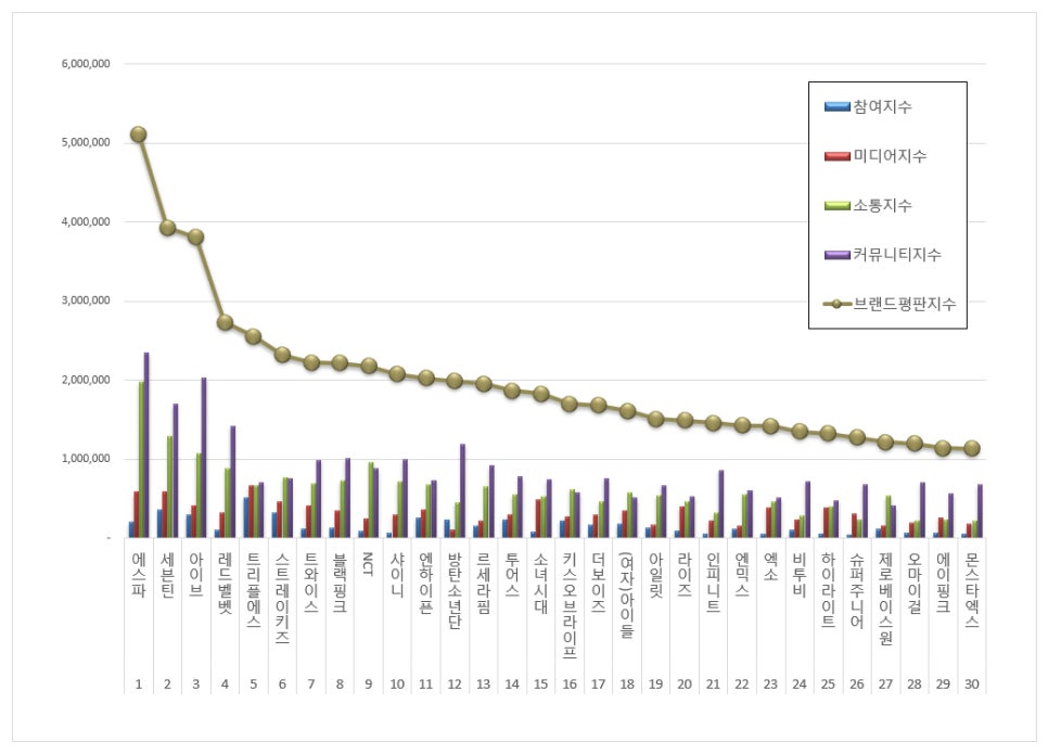 aespa și-a menținut poziția de top în clasament luna aceasta, cu un indice de reputație a mărcii de 5.112.782. Printre frazele cu cel mai mare rang în analiza cuvintelor cheie ale grupului se numără „Supernova”, „putere digitală” și „turneu global,” în timp ce termenii cu cel mai mare rang asociați includ „de lungă durată”, „puternic” și „a demonstra.” Analiza de pozitivitate-negativitate a aespa a relevat, de asemenea, un scor de 93,45% reacții pozitive.