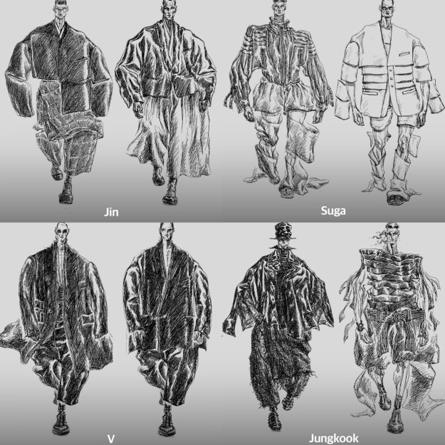 Concepute de designerul coreean Jay Songzio, ținutele membrilor BTS au adus în fața publicului o reinterpretare a hainelor tradiționale și armurilor din vremea dinastiei Joseon. Sub numele „Armură Lirică”, colecția special creată pentru acest eveniment a reimaginat moștenirea culturală a Coreei prin „siluete sculpturale și o paletă monocromatică. Concepute pentru a fi mai mult decât simple costume de scenă, piesele au făcut parte integrantă din firul narativ al spectacolului, poziționând trupa BTS ca protagoniști culturali ai zilelor noastre. Fiecare membru – RM, Jin, SUGA, J-Hope, Jimin, V și Jungkook – a primit un arhetip în cadrul poveștii vizuale”, informează portalul Women’s Wear Daily.